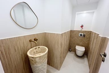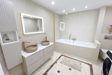 L’appartement est également équipé d’une grande salle de bain moderne avec baignoire, lavabo double vasque, toilettes, et coin lave linge ainsi que des WC séparés, pour + de confort au quotidien.