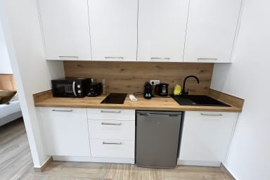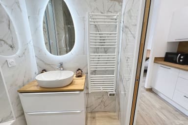 La cuisine indépendante, spacieuse et entièrement équipée (Nespresso, micro-ondes, plaque vitrocéramique, vaisselle, etc.), ravira les amateurs de gastronomie maison 🍳. Vous apprécierez également la salle de douche moderne, pensée pour votre confort et votre bien-être 🛁.