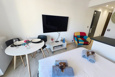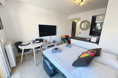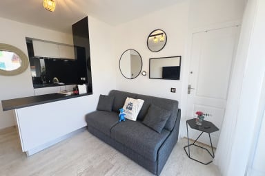 Studio charmant rénové avec goût en 2022 , capacité d’accueil de 2 personnes. Il se compose d’une pièce à vivre avec canapé convertible pour deux personnes et matelas de qualité, cuisine séparée entièrement équipé avec machine à café Nespresso, lave-linge, lave-vaisselle, réfrigérateur, plaques de cuisson.