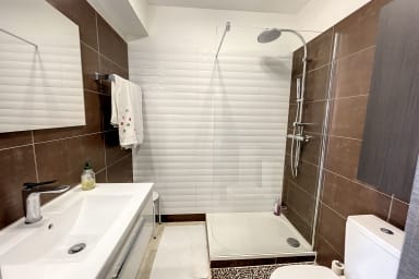 Salle de bain avec douche à l’italienne et WC séparé. TV, Wi-Fi et climatisation complètent ce logement lumineux et dans un environnement calme et verdoyant.